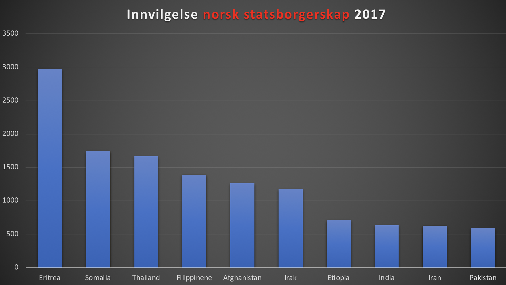 Hvis vi ser på hvem som fikk tildelt norsk statsborgerskap i 2017 ligger Eritrea desidert på topp med 2.971 tildelinger. Deretter følger Somalia (1.746) og tett på Thailand, Filippinene, Afghanistan og Irak, jamfør figur (kilde: SSB).