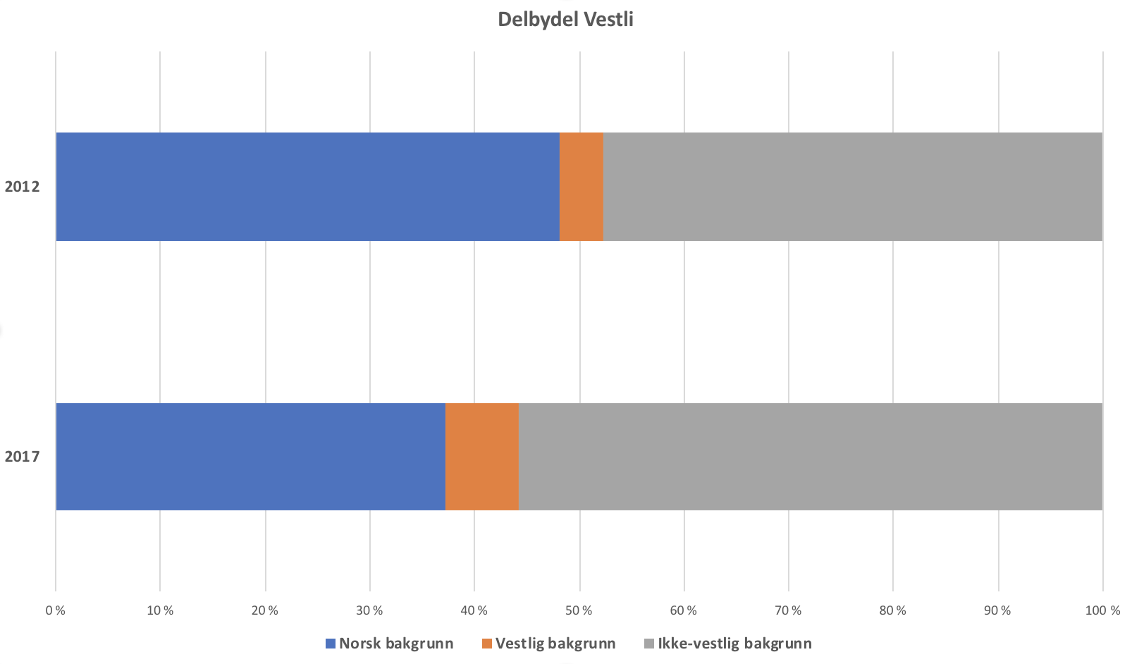 I 2017 var innvandrerandelen økt til 62,8 prosent, herav 55,8 med ikke-vestlig bakgrunn (opp 8,1 prosentpoeng på fem år) og 7 prosent vestlige (opp 2,7 prosentpoeng). De med norsk bakgrunn har i samme periode gått tilbake med 10,9 prosentpoeng, fra 48,1 i 2012 til 37,2 i 2017.