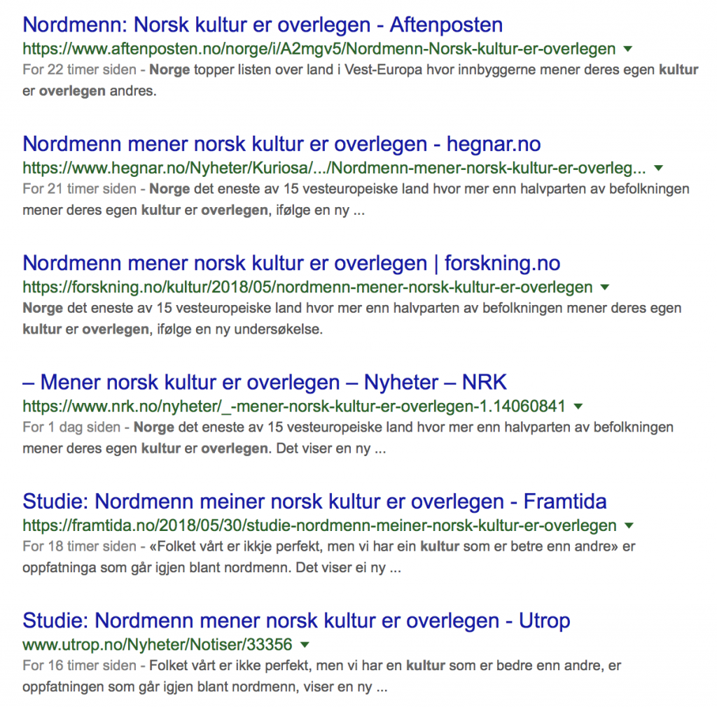 Landets kulturrelativister har tilsynelatende fått åndenød av resultatet, og mediene velger selvfølgelig å fremstille det hele som noe negativt: 58 prosent føler seg overlegne, må vite! Æsj, noe så teit!