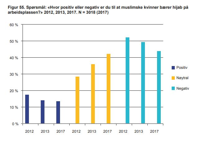 Integreringsbaromteret viser at flere og flere forholder seg nøytralt til hijab på arbeidspalssen. De mest positive er kvinner (!) og unge. Og jo mer positiv man er til innvandringen, dess større er aksepten for hijab.
