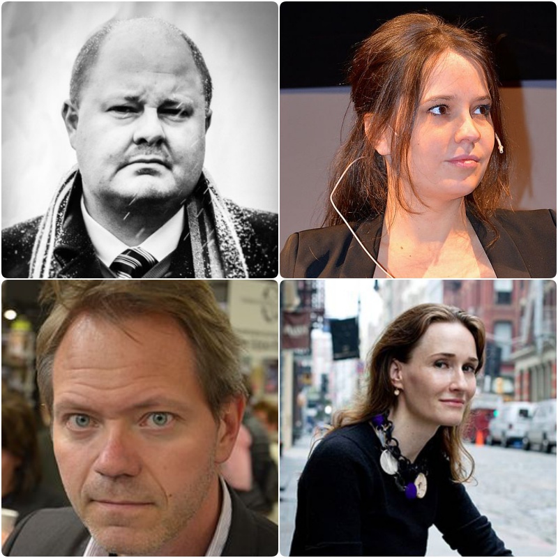 Sjefredaktør i Expressen Thomas Mattson, kultursjef i Expressen Karin Olsson, sjefredaktør i Svenska Dagbladet Fredric Karén, journalist i Svenska Dagbladet Jenny Nordberg. Bilder: Wikipedia.