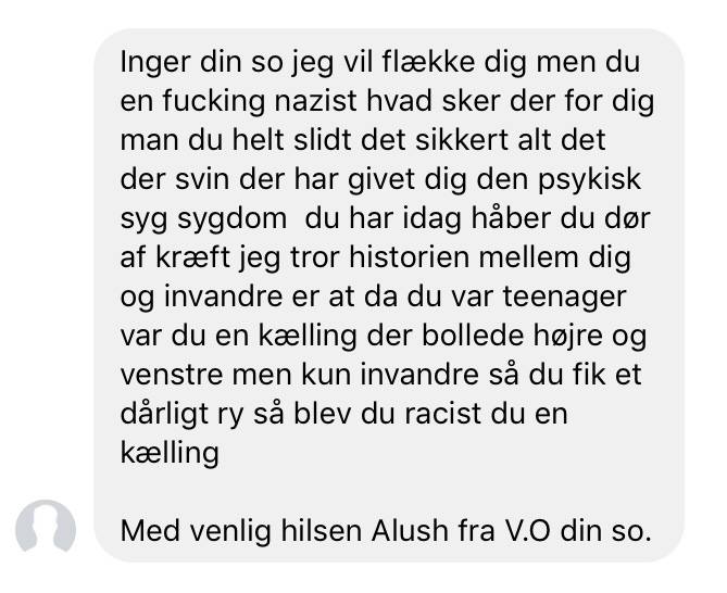 Og da får hun selvfølgelig bare som fortjent. Innholdet i innboksen hennes trenger neppe ytterligere kommentarer, men husk nå endelig på at det er offisielt vedtatt at det er høyresiden og/eller innvandringskritikere som er fæle på nett.