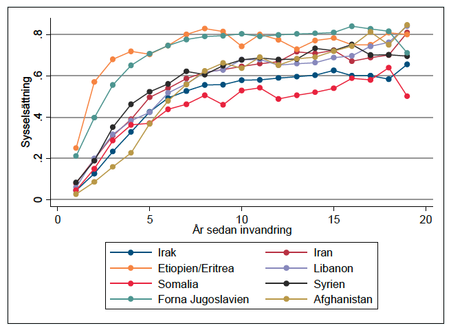Under ser vi figur 2.3 i rapporten som viser sysselsetting fordelt på opprinnelsesland og år siden innvandret til Sverige (menn innvandret 1996-2000). Som vi ser er det irakiske og somaliske menn som har svakest tilknytning til arbeidslivet.