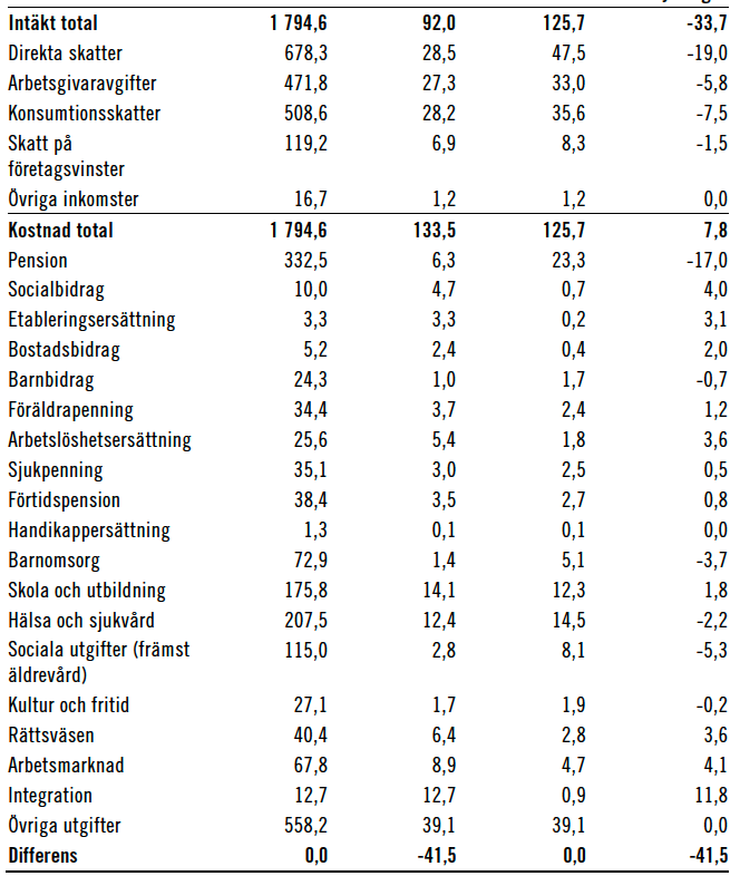 Ruist har også laget en interessant sammenligning med inntekter og kostnader for totalbefolkningen versus innvandrerne – og hva disse faktisk måtte være for å gå i null (kolonne tre). Her ser vi at de totale utgiftene (inntekter minus kostnader) for invandringen i 2015 var på 41,5 milliarder SEK.
