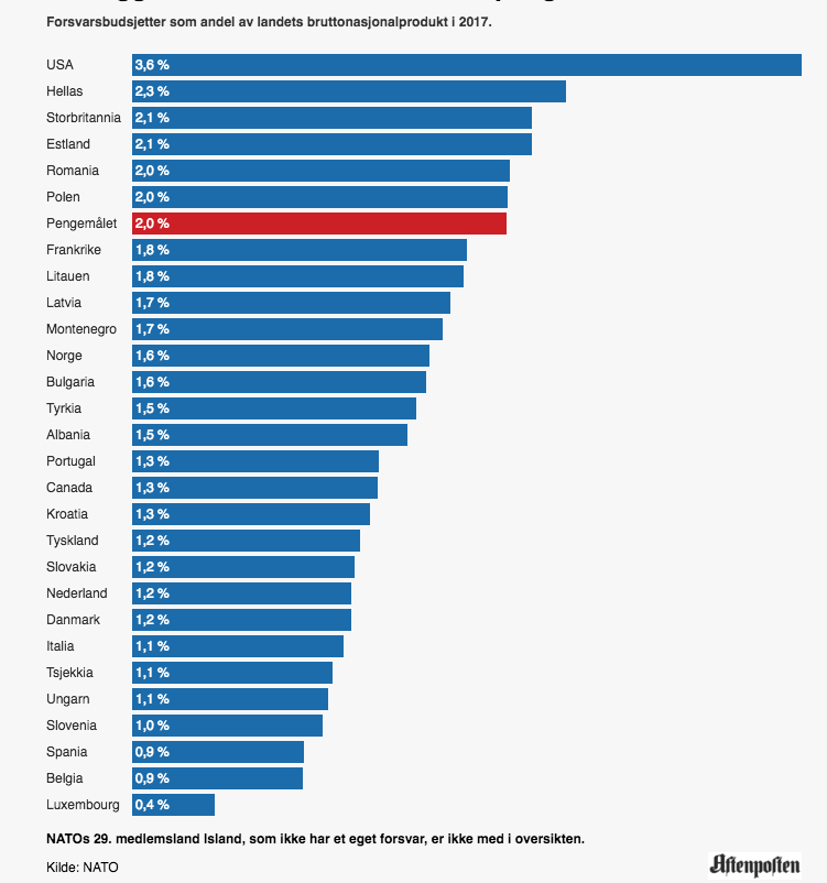 Og utvilsomt har ikke Regjeringen ved Solberg noen problemer med å finne ut av hvordan Norge skal bruke penger – det er nok å ta av. Stille er det også fra generalsekretær i NATO, Jens Stoltenberg, som visstnok skal ha utpekt Norge, Danmark, Nederland og Tyskland som de fire land som utmerker seg spesielt til å kunne oppnå to prosent-målet.