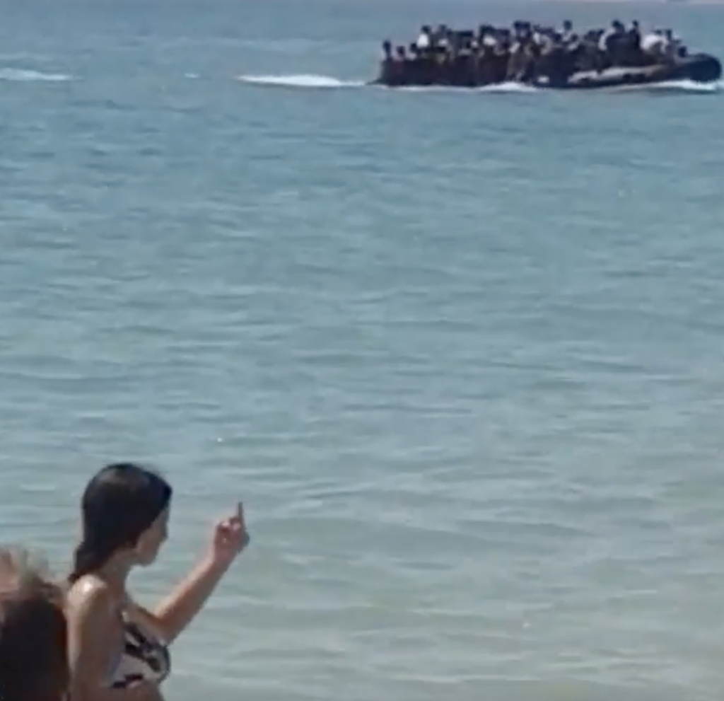 Men neppe alle turistene var fornøyd med migrantene som tok seg i land, en av kvinnene viser fingeren til de ulovlige migrantene.