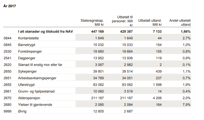 I Norge ble ca. 7,1 milliarder utbetalt til utlandet i 2017, der over halvparten er alderspensjoner (4,2 milliarder), deretter følger uføretrygd (1,6 milliarder). De fleste mottakerne er norske statsborgere. Motsatt er bildet for dagpenger og kontantstøtte, der ni av ti er utenlandske statsborgere. 309 millioner kroner gikk til barnetrygd og foreldrepenger. Jamfør figur under fra Nav: