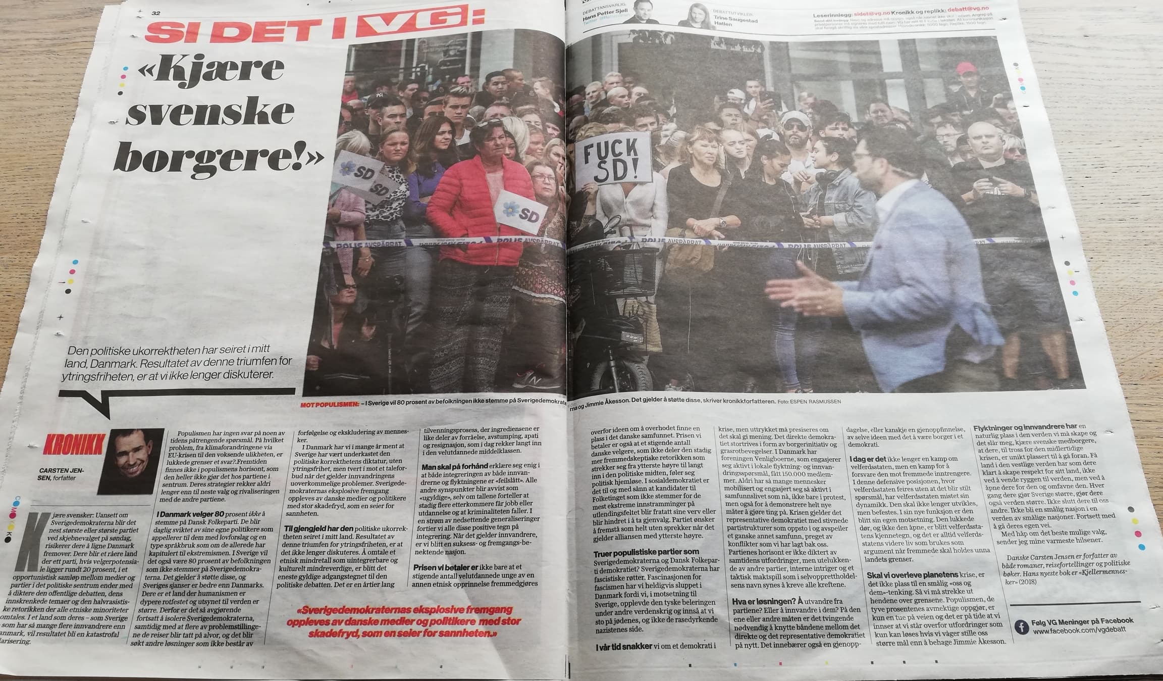 Den danske forfatteren Carsten Jensen publiserer en to-siders i VG i dag, hvor han oppfordrer svenskene til ikke å stemme Sverigedemokratene (SD), hvorpå han «minner om» at 80 prosent av danskene ikke stemmer Dansk Folkeparti – og at «det samme» vil skje i Sverige med SD.