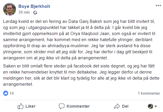 Bjerkholt har åpenbart forstått at han har begått «en feil». Like etter kl 11 la han ut denne beskjeden på Facebook: