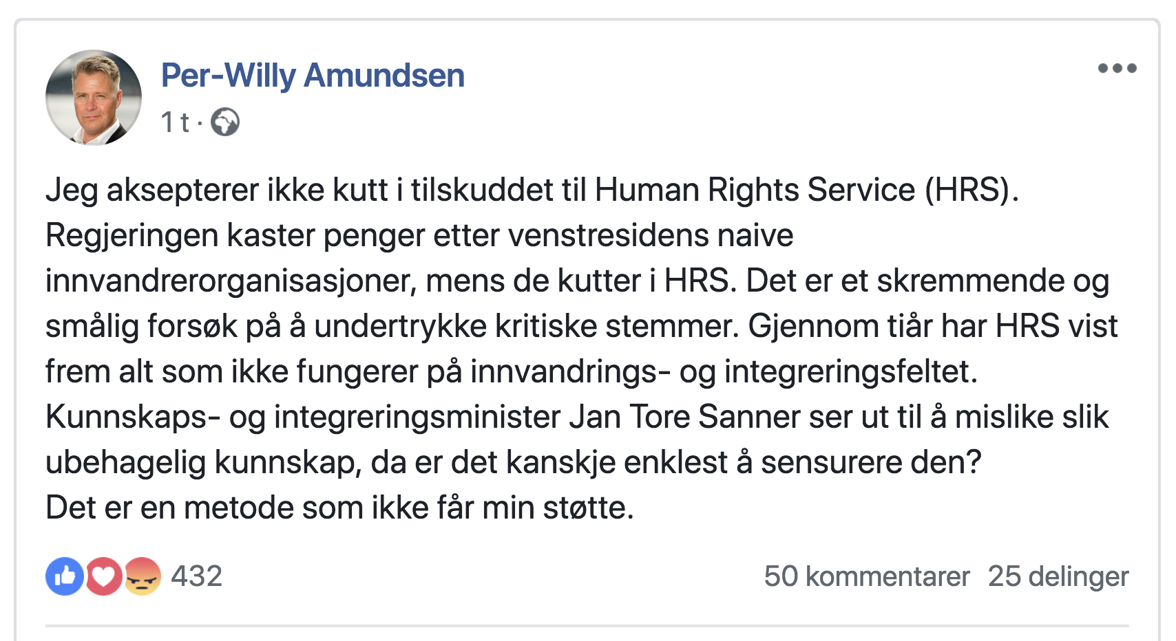 Inntil da skal Norge fortsette å finansiere innvandringsliberale organisasjoner, mens HRS som den eneste innvandringsrestriktive – som dertil dokumenterer alt vi foreslår – skal åpenbart fases ut. Noe heldigvis ikke alle i FrP liker. Tidligere justisminister Per-Willy Amundsen kommenterer det slik på Facebook:
