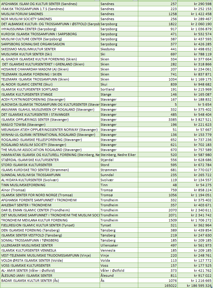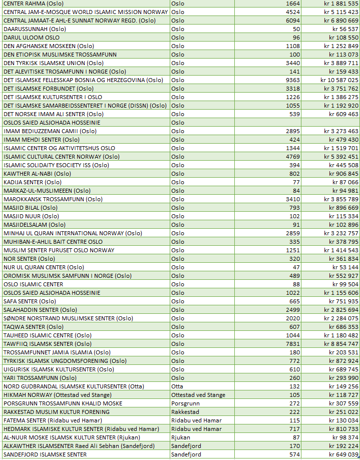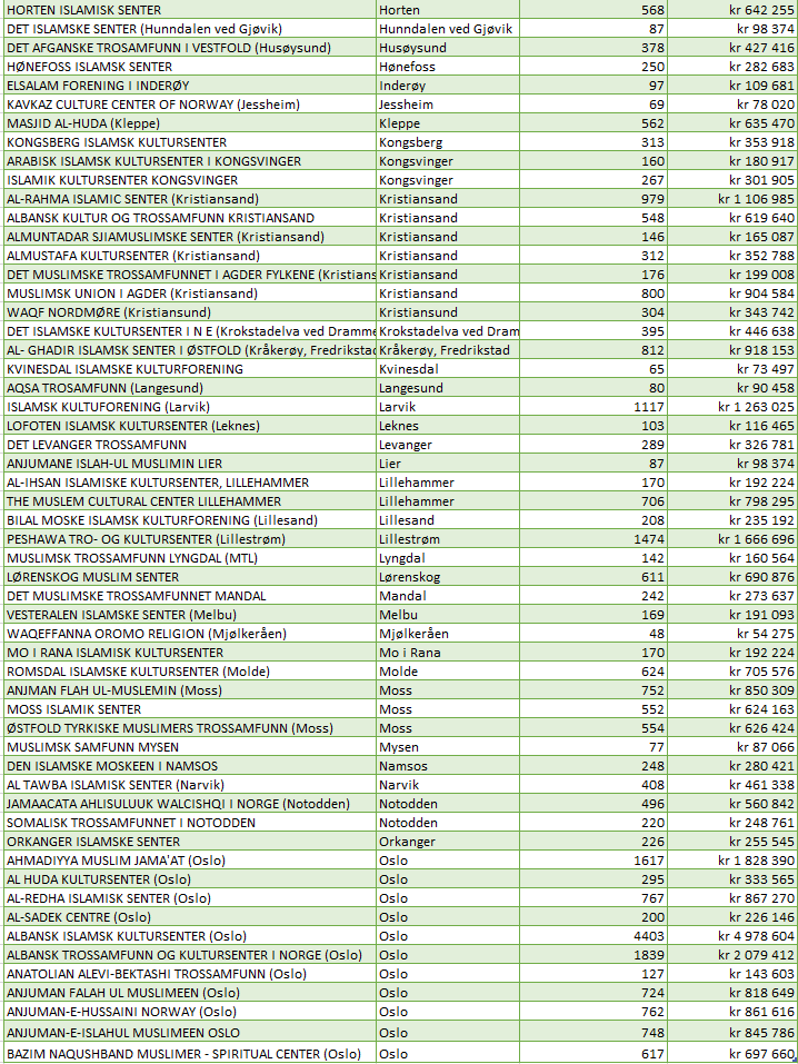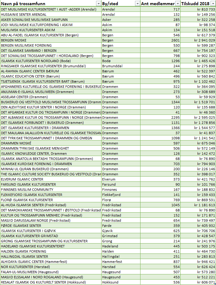 Vi har allerede gitt en generell oversikt over hvilke byer og steder som har moskeer nå og antallet (lenken over). Flere vil gjerne ha det fulle navnet også. Vi har således laget fire bilder fra vårt arbeidsark, redigert alfabetisk etter byer og steder, som er basert på regjeringens egen oversikt over alle trossamfunn som i 2018 mottar offentlige tilskudd. Her ser man også medlemstallet og beregnet tilskudd: