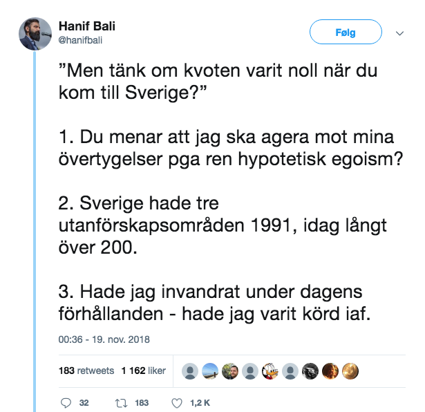 På twitter får Bali spørsmålet, men tenk om kvoten var null da du kom til Sverige, hvorpå han svarer elegant: