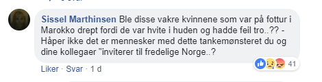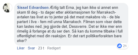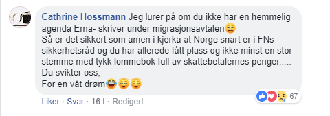 «En statsminister som ignorerer sitt eget folk i saker som bryter med grunnloven, og som er totalt fraværende når en ung norsk jente blir myrdet på det mest bestialske vis 5 mil unna der en av disse ble behandlet. Som velger å ikke løfte en finger for å trygge sitt folk i en tid hvor vi faktisk hadde trengt og fortjent en statsmann som satte sitt land og folk, og deres sikkerhet først. Henne stoler du på?»