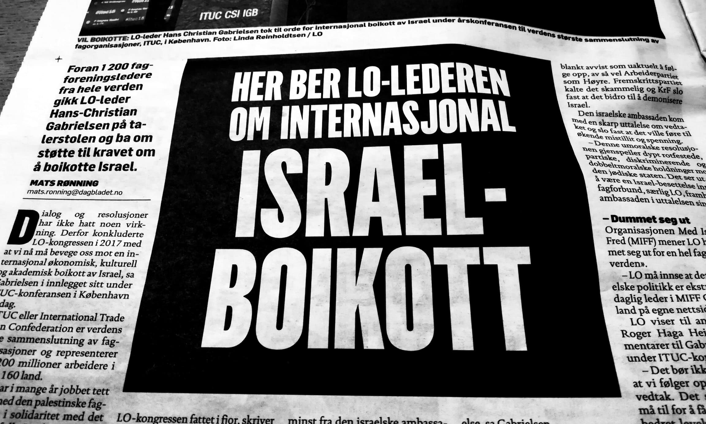 «Foran 1.200 fagforeningsledere fra hele verden gikk LO-leder Hans-Christian Gabrielsen på talerstolen og ba om støtte til kravet om å boikotte Israel.»