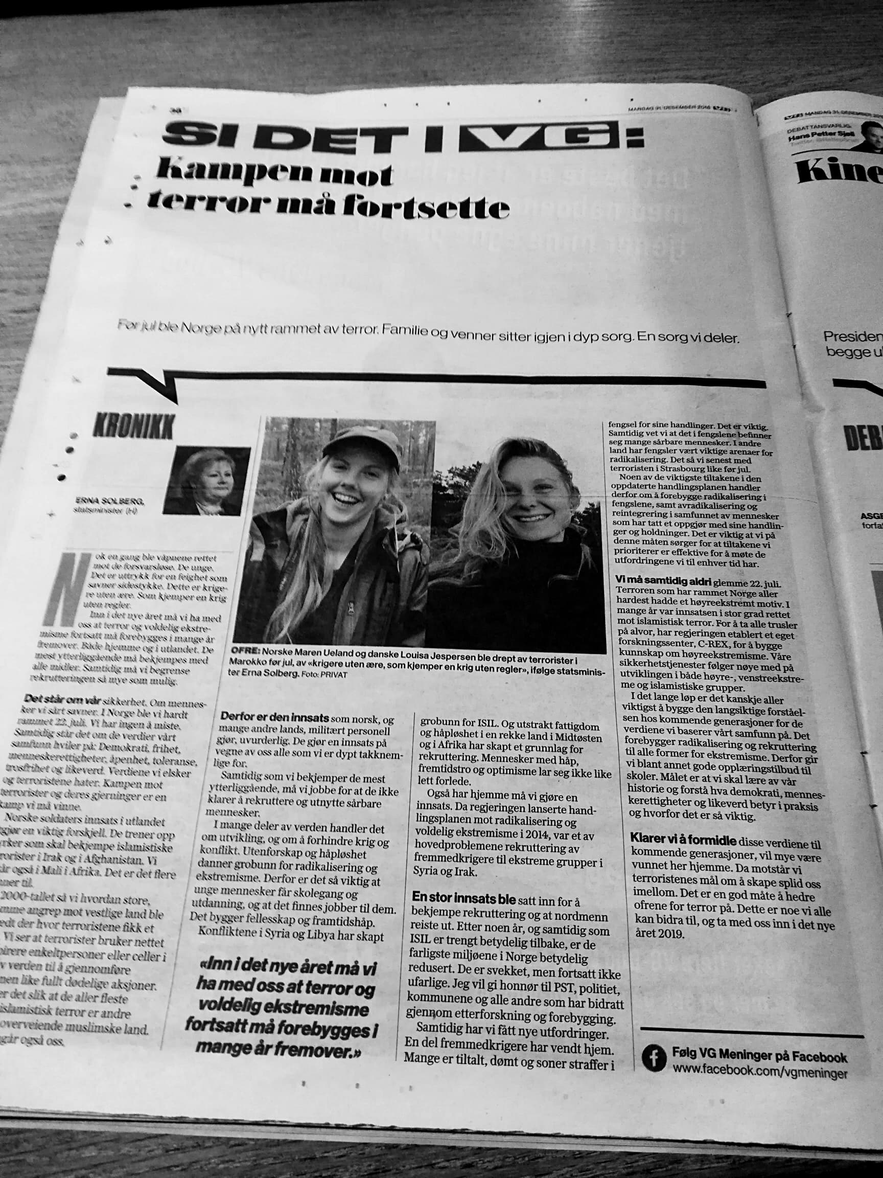 Statsminister Erna Solberg (kronikk VG 30. desember) sier vi må bekjempe terror og voldelig ekstremisme med alle midler. Hun mener at når våpnene blir rettet mot forsvarsløse mennesker er det utrykk for feighet som savner sidestykke. Det er krigere uten ære og regler, skriver vår statsminister. Hun er sjokkert, slik som så mange godværspolitikere blir når volden rammer – særlig unge, norske, uskyldige kvinner som Maren Ueland.