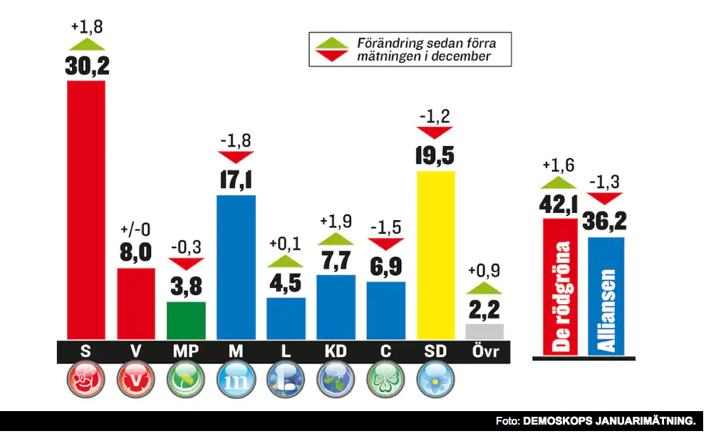 Demoskops januarmåling (endringer fra måneden før) viser fremgang for Socialdemokraterna og Kristdemokraterna (KD), mens Lööfs Centern taper terreng. Miljöpartiet ligger på denne målingen under sperregrensen, mens Liberalerna knapt holder seg over. Taper terreng gjør også Moderaterna (M) og Sverigedemokraterna (SD), men sistnevnte ligger fortsatt høyere enn valgresultatet.