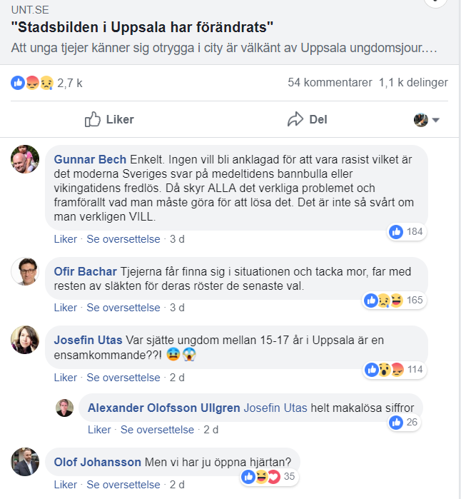 Uppsala har gått gjennom en dramatisk transformasjon etter 2015. En undersøkelse utført av Region Uppsala viser at jenter i alderen videregående skole som opplever seg trygge i byens sentrum raste fra 45 prosent i 2013 til 19 prosent i 2017.