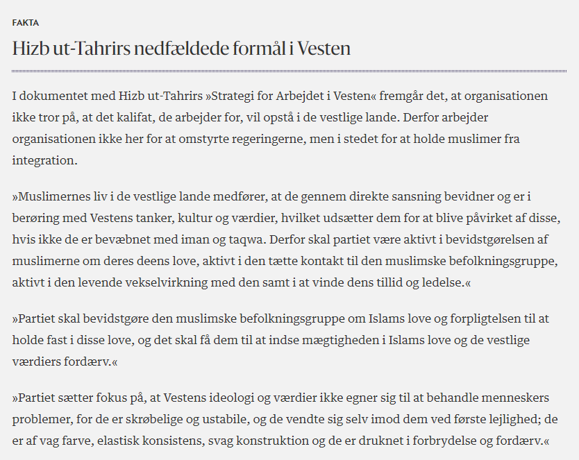 Berlingske har fått tilgang på strategidokumentet fra 2005. Dokumentet levner ingen tvil: Hizb ut-Tahrir (HuT), arbeider aktivt for at danske og eruopeiske muslimer skal snu ryggen til vestlige samfunns verdier og heller dyrke fullt ut den islamske identiteten og islamske lover og regler. «Vestens tanker, kultur og verdier», må holdes å en amlengdes avstand, og vel så det.