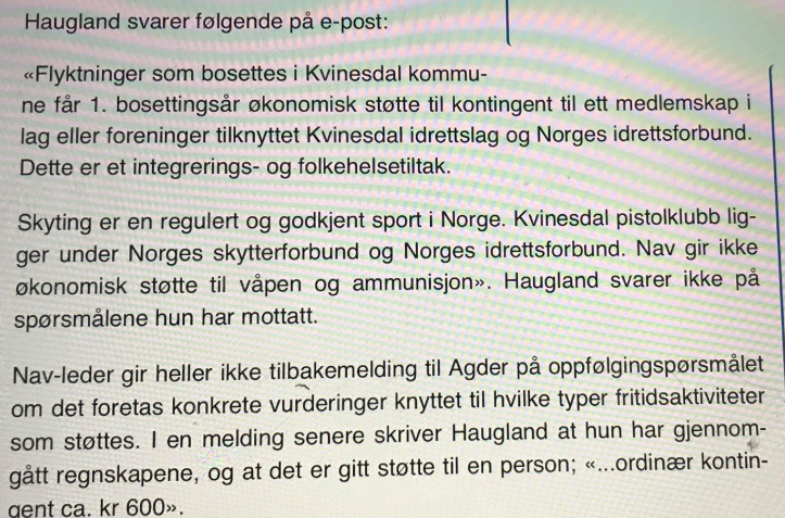 Saken er omtalt flere steder i dag, og hos NRK presiserer nå NAV at det kun er én flyktning som får betalt kontigenten i Kvinesdal pistolklubb, som skal ha flere medlemmer med flyktingebakgrunn fra Syria.