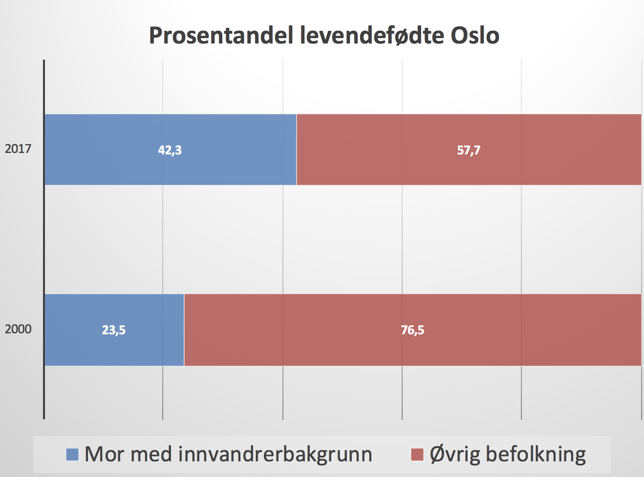 Uansett så forteller tallene oss at Oslos befolkning skiftes ut. Dersom en gjennomsnittlig årlig vekst i prosentpoeng fortsetter på samme måte de neste 17 årene, vil over seks av ti nyfødte i Oslo ha mor med innvandrerbakgrunn i 2034. Det tilsier igjen at fra 2025 vil det fødes flere barn i Oslo med mor med innvandrerbakgrunn enn uten.