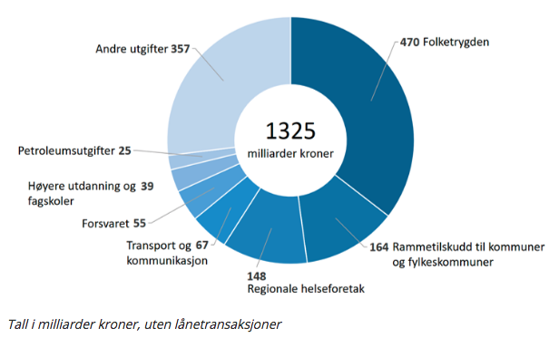 Norge bruker totalt 470 milliarder på folketrygden (2018-tall), som ca. er en tredjedel av statsbudsjettet. Folketrygden inkluderer alderspensjon, sykepenger, uføretrygd, arbeidsavklaringspenger og arbeidsledighetstrygd.