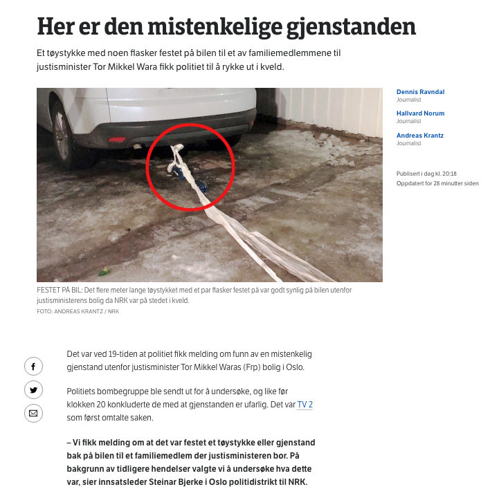 I kveld ble det kjent at justisminister Tor Mikkel Waras bolig ble angrepet nok en gang. Denne gangen ble det funnet «en mistenkelig gjenstand» ved 19-tiden som utløste tilkalling av bombegruppen.