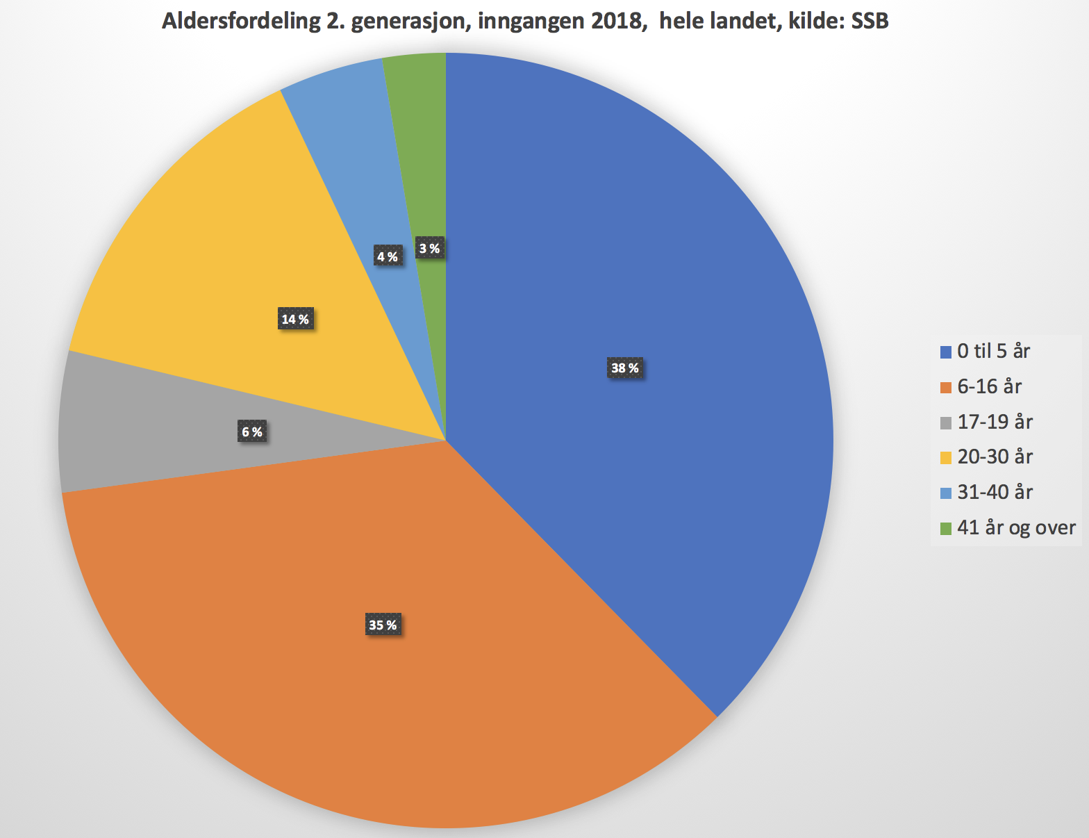 2. generasjon besto ved inngangen til 2018 (siste tilgjengelige tall) av totalt 169.964 personer. Hele 73 prosent (123.817) var under 17 år. Av disse igjen var 63.984 barn (38 prosent) i alderen 0 til 5 år, under skolepliktig alder. Resten i denne gruppe, altså i skolepliktig alder (6 til og med 16 år), var dermed på nesten det samme, 59.833 personer (35 prosent). Dermed vet vi at landet trenger mye penger til barnehage og skole.