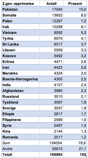 Ifølge SSB (statistikkbanken) er 2. generasjon fordelt på 173 land. Hvis vi tar med de 21 største gruppene, dekker vi 76 prosent av 2. generasjon. Tar vi med alle grupper med over 2.000 personer, tilsier det 23 land som igjen utgjør 79 prosent (134.054 personer) av alle i 2. generasjon.