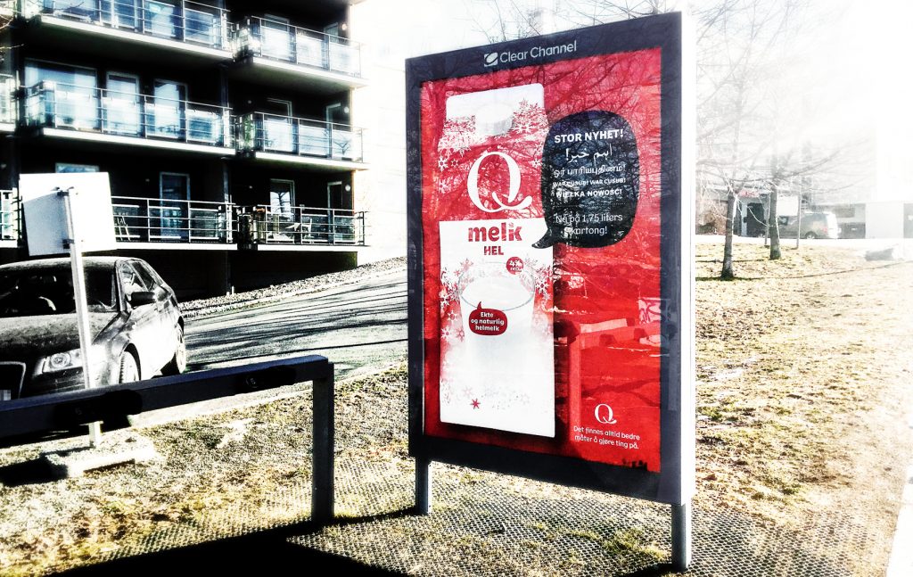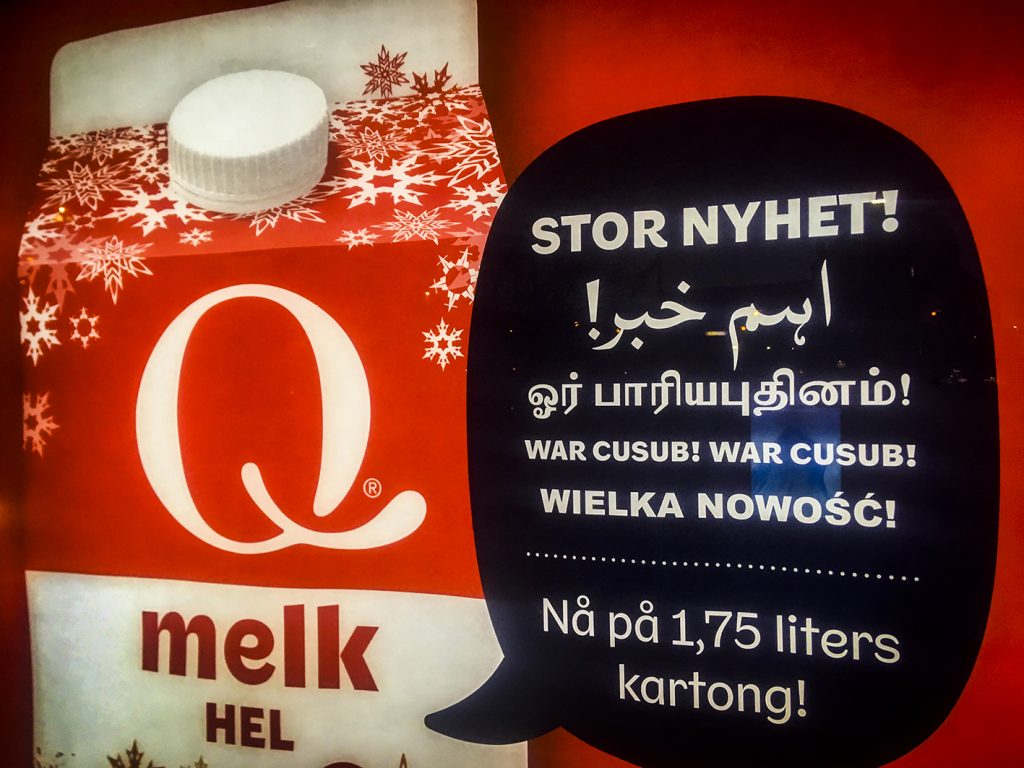 Denne reklamen på rundt 2 ganger 1,5 meter, møtte nylig beboere på og ved Ensjø i Oslo øst. I fallende rekkefølge reklameres det på disse språkene: norsk, urdu, tamilsk (noe usikkerhet fra vår side akkurat der), somalisk og polsk.