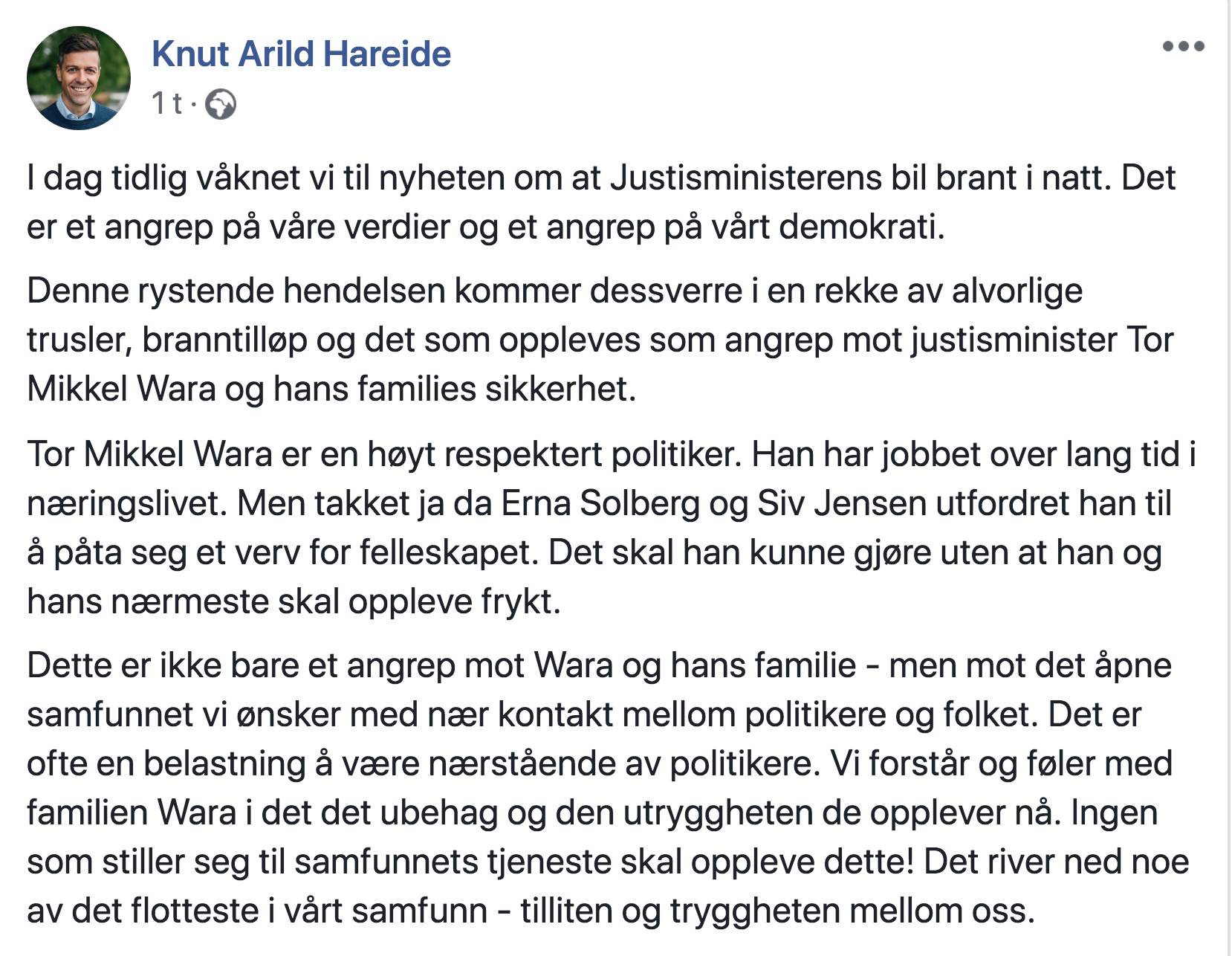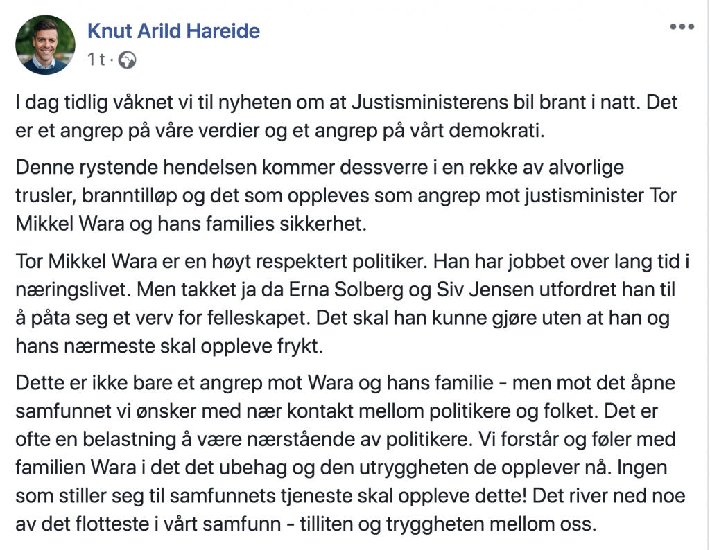 Knut Arild Hareide (KrF) har rykket ut med et forsvar til Wara og familien på sin Facebookside. Han kaller angrepet «et angrep på våre verdier og et angrep på vårt demokrati».