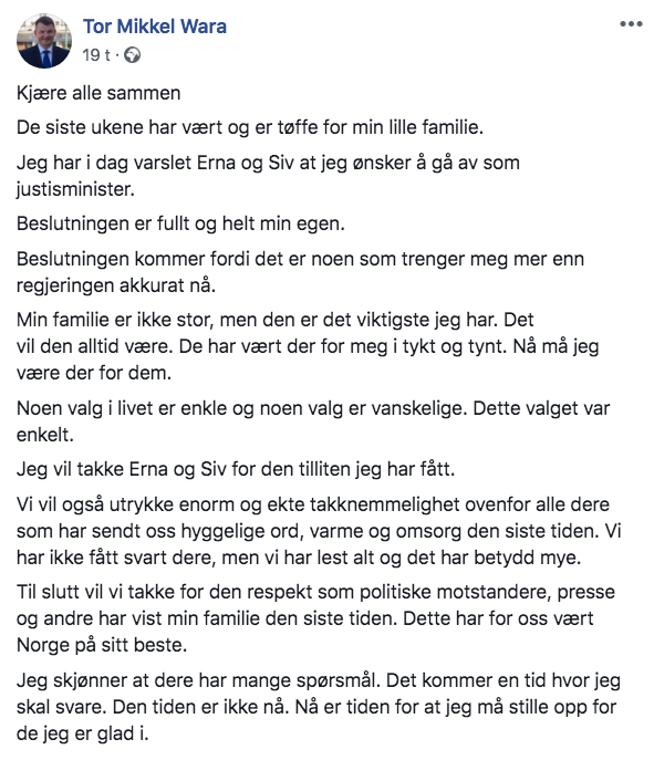 28. mars gikk Tor Mikkel Wara av som justisminister. Samme dag hadde PST bekjentgjort at hans samboer, Laila Anita Bertheussen, er siktet for alle hendelsene mot familien. Det var en dypt rørende pressekonferanse i går hvor Wara og statsminister Erna Solberg deltok, og begge så sterkt berørt ut. Wara fremsto som en flott mann med stort hjerte for sin familie, og han sa at for ham var dette valget «enkelt» – for «noen trenger meg mer enn regjeringen».