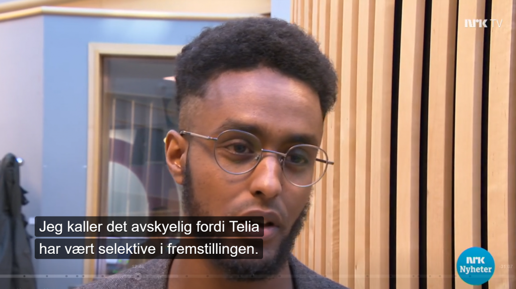 NRK har jo allerede valgt side, så her må Foss kjøres mer. Bjurstrøm spør derfor om Telia, da de lot den ene være alvorlig, den andre ikke, tenkte Telia da på at det kunne avstedkomme reaksjoner?