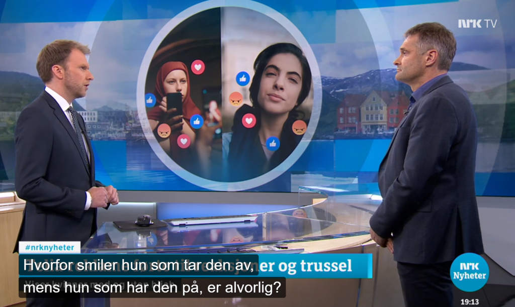 Bjurstrøm sa faktisk: antydning til smil hos kvinnen som tar av hijaben, og en sterk grad av alvor hos hun som tar på seg hijaben, men oversetterne hos NRK er ikke nødvendigvis presise alltid.