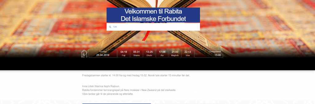 Tar man turen til moskeen til Det islamske forbundet, Rabita (Brorskapets bastion i Norge), er det også helt taust om Sri Lanka-massakrene av 359 personer, de fleste drept i kirker. Slik ser frontsiden til rabita.no ut