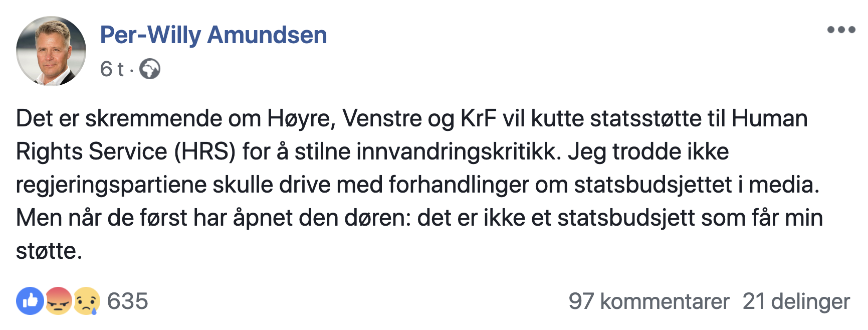 En av dem som reagerte, var FrPs Per-Willy Amundsen. Som han skriver på FB: