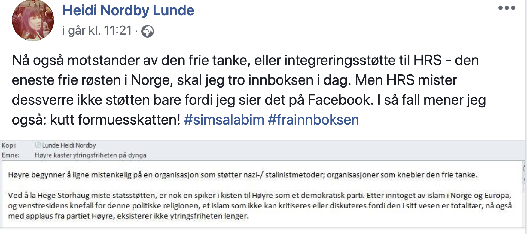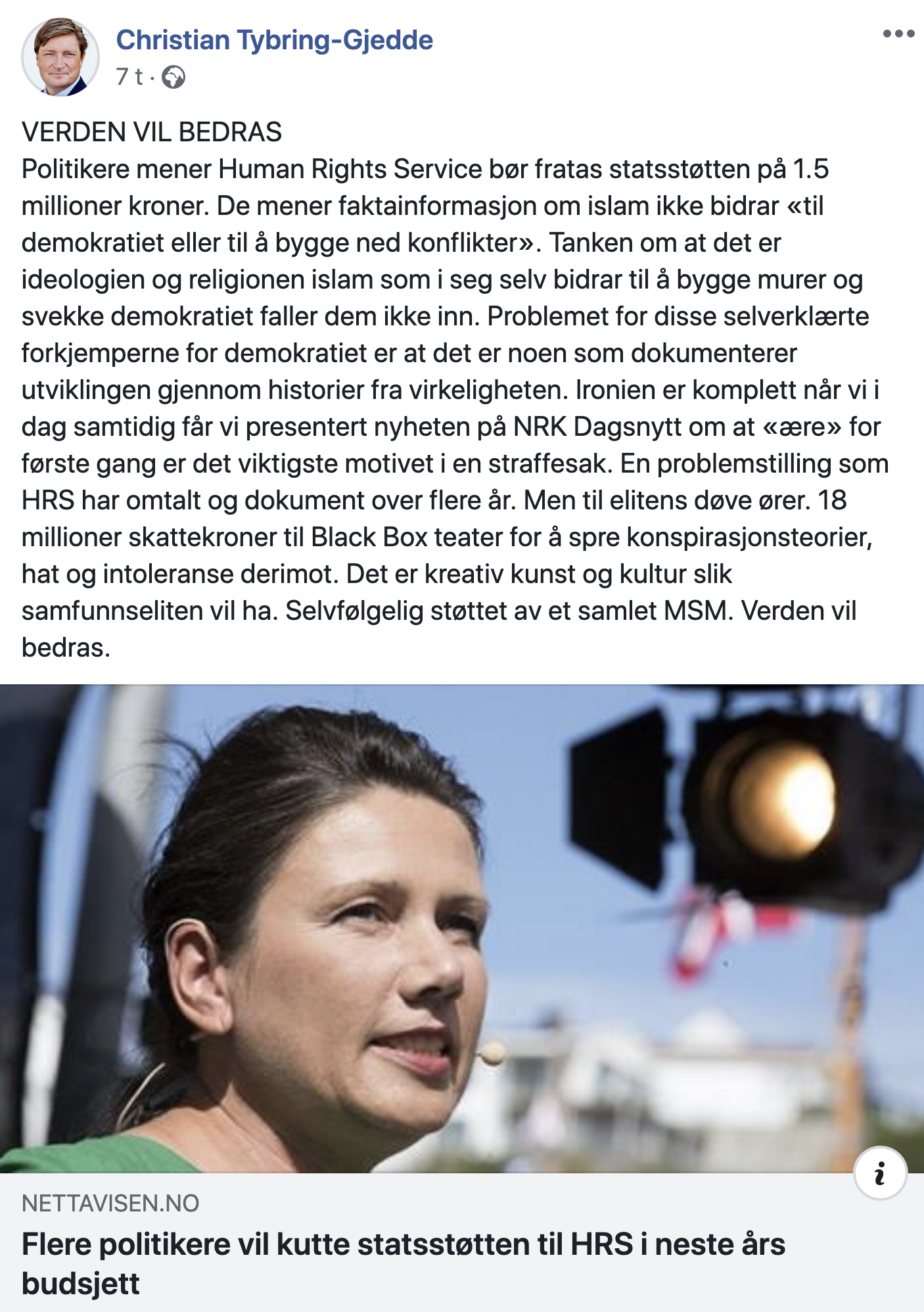 Heidi Nordby Lunde viser på Facebook til at under en uke etter terrorangrepene på to moskeer i New Zealand, så «føler Hege Storhaug for å legge ut dette». Vel, føler får være en strategi Nordby Lunde følger, her i huset så tenker vi. Men igjen er temaet at HRS skal fratas statsstøtten. Et syn som Vårt Land har innhentet støtte for (selvsagt) hos Venstres Abid Q. Raja, mens KrFs finanspolitiske talsperson Tore Storehaug ønsker at HRS skal få tildelt statsstøtte etter «faglige kriterier». Sistnevnte støtter HRS fullt ut, og det burde (selvsagt) gjelde alle ikke-statlige frivillige organisasjoner (NGO-er).
