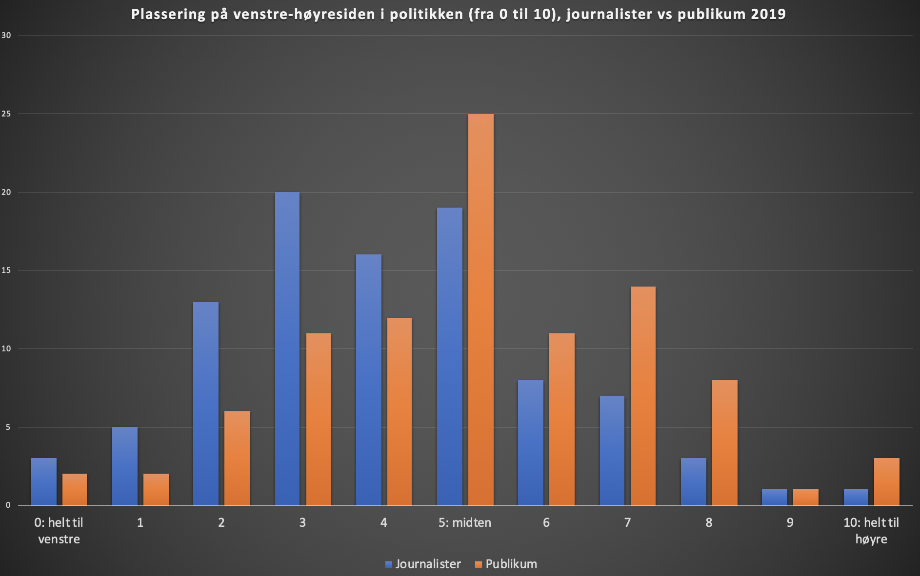 Motsatt plasserer 20 prosent av journalistene seg til høyre for midten, mot 33 prosent av publikummet.