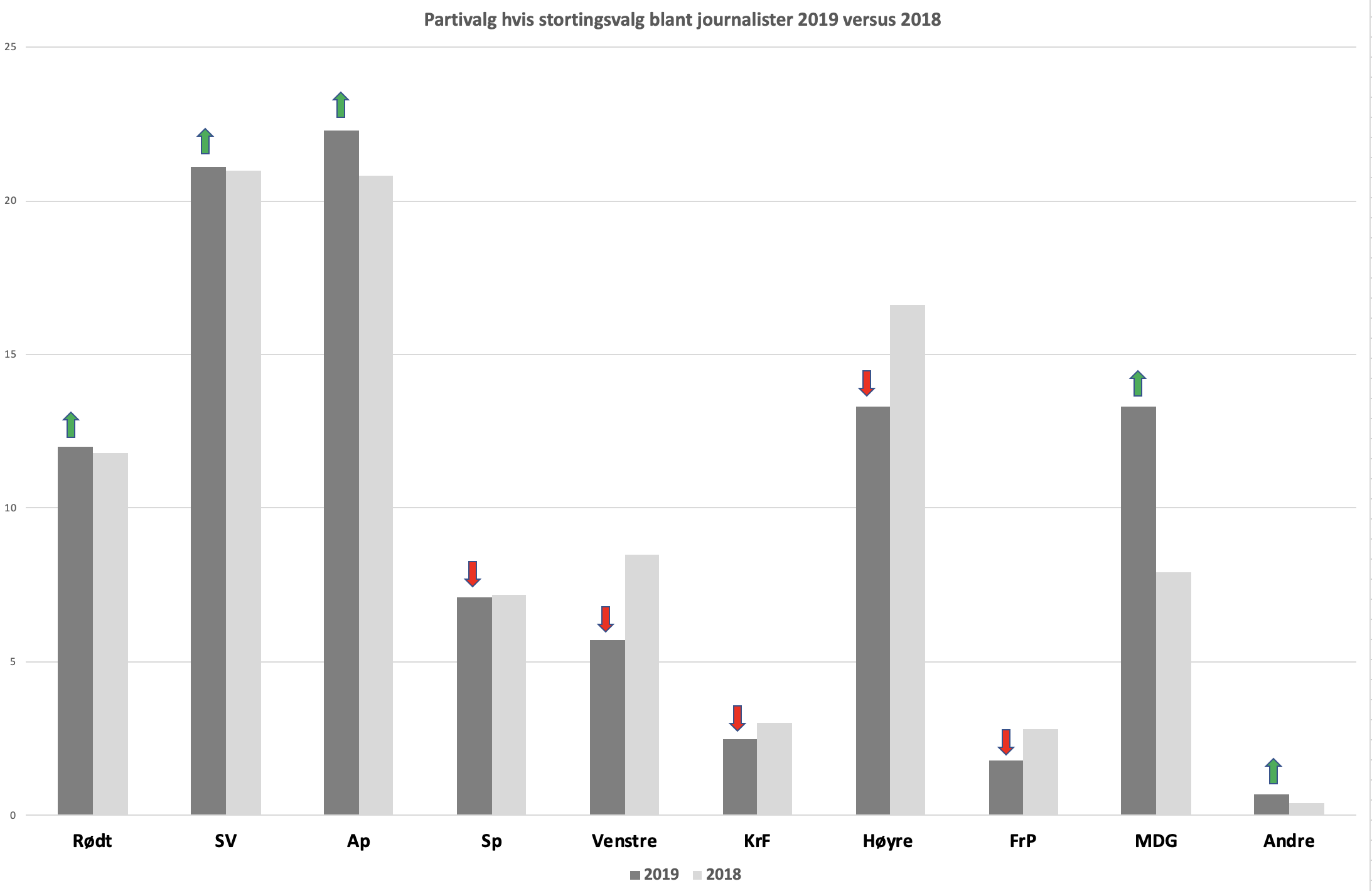 Men den klart største økningen hos journalister finner vi hos MDG. Mens «bare» 7,9 prosent ville stemt på dem i 2018, sier nå hele 13,3 prosent av de ville ha valgt MDG (en økning på 5,4 prosentpoeng). Det gjør MDG og Høyre like store i «2019-valget», da Høyre har falt fra 16,6 prosent i 2018 til 13,3 prosent i år. Her følger Rødt hakk i hæl med sine 12 prosent (en svak økning på 0,2 prosentpoeng fra 2018).