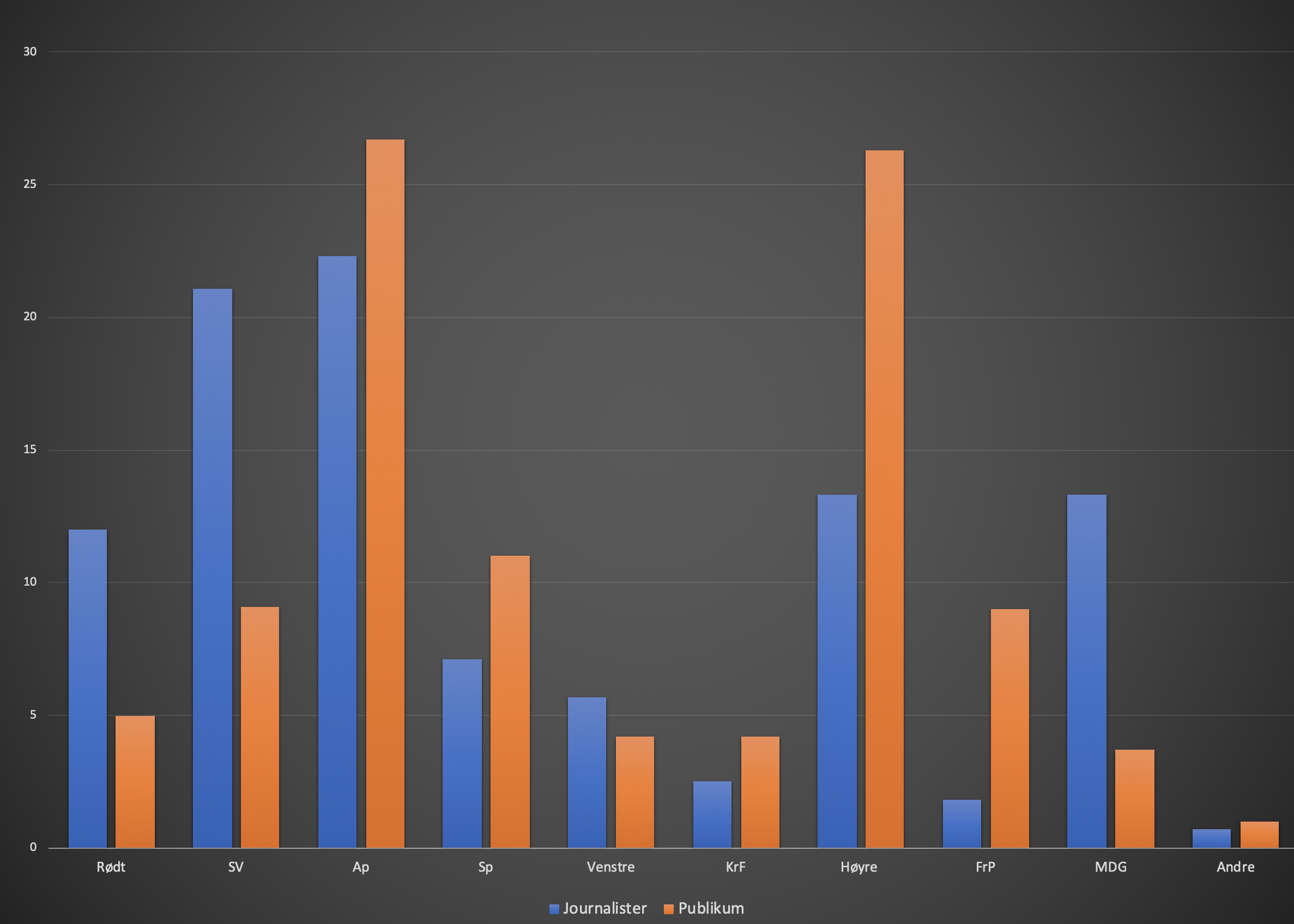 Ser vi på journalisters partivalg versus publikums ser vi at differansen er store for de fleste partier, kanskje med unntak av Venstre og KrF. Både Venstre og KrF får 4,2 prosent hos publikum, mot Venstres 5,7 prosent hos journalister og KrFs 2,5 prosent. Ap gjør det også bra hos publikum med 26,7 prosent (mot journalistenes 22,3 prosent), og er det største partiet – men tett fulgt av Høyre.