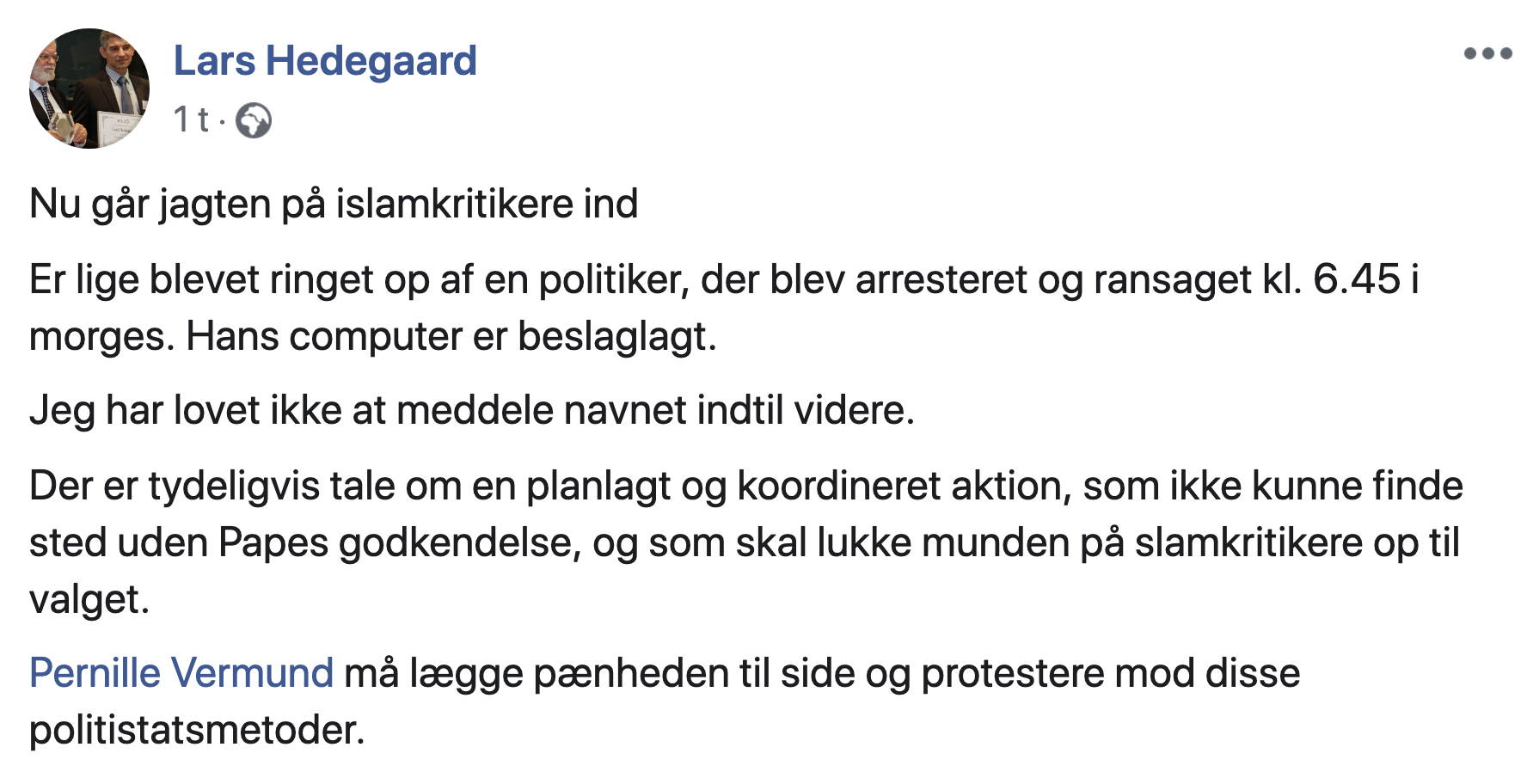 Hvis dette er en koordinert politiaksjon, med politisk velsignelse, og med mål om å stilne islamkritiske stemmer, er Danmark ikke bare på ville veier. Da har de lagt seg inn på en særdeles farlig vei.