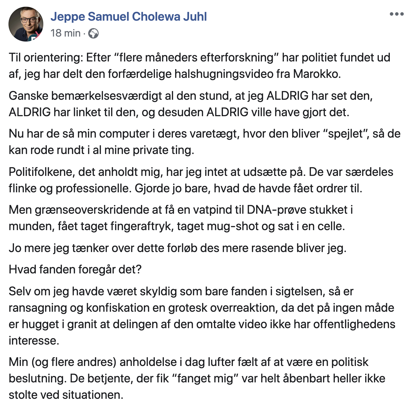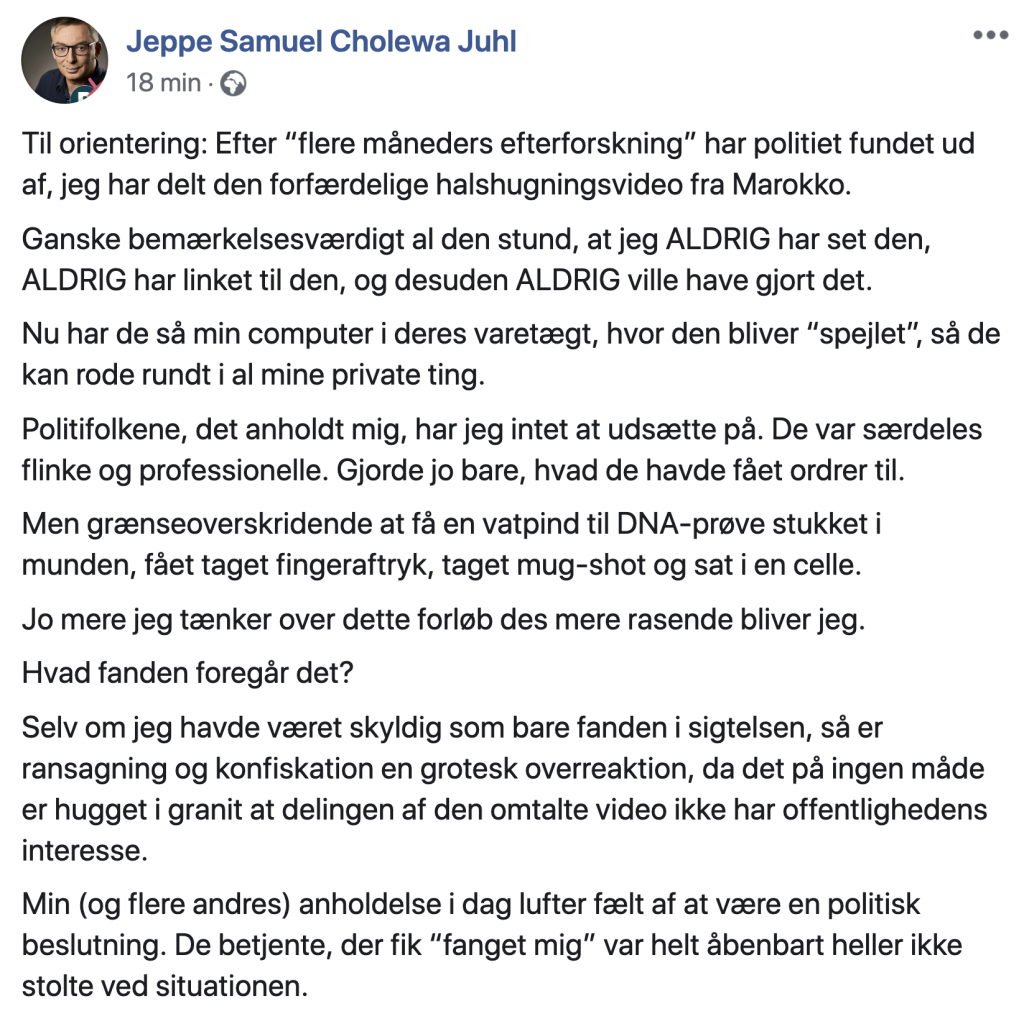 At Hedegaard etterlyser Nye Borgeliges leder Pernille Vermund er ikke tilfeldig, da den andre som havnet i politiets klør er hennes toppkandidat Juhl. Også han siktet for å ha delt videoen fra Marokko. Juhl hevder selv på FB at han aldri har delt denne videoen: