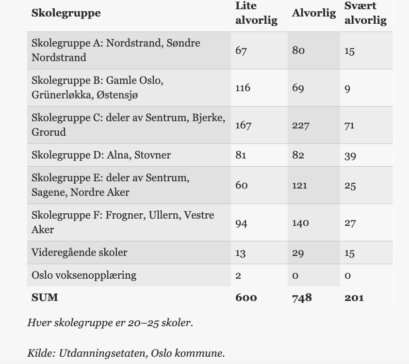 Videre heter det i VG at rapporten ikke skiller mellom de ulike Oslo-skolene spesifikt, og at det ikke fremkommer i hvilke deler av byen det er flest voldshendelser.