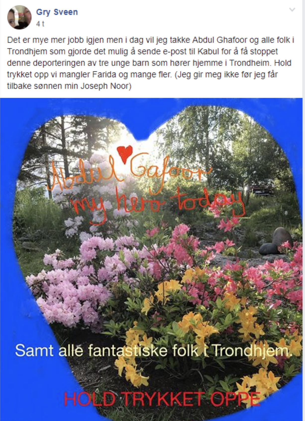 En gruppering som har frontet familiens situasjon, er «Refugees Welcome to Norway». På deres Facebook-side, som blant annet administreres av personer ansatt i det offentlige finansierte Antirasistisk senter, finner vi blant annet dette innlegget fra det aktivisten Gry Sveen (noe som også hennes åpne FB-profil vitner om, der vi finner samme innlegg):