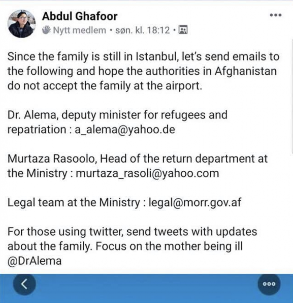 Adresseavisen har via en tredjepart vært i kontakt med kilder nært flyktningministeren Sayed Hussain Alimi Balkhi i Afghanistan, blant dem rådgiver Morteza Rasooli.