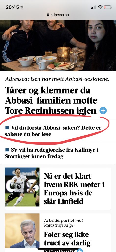 Bedre blir det heller ikke om vi forholder oss til Adresseavisa, lokalisert i Trondheim der Abbasis-familien bor. Her fremkommer det at støttegruppe-Vegge selv har tatt turen sørover for å møte søsknene. Dette er vel penger som heller kunne vært benyttet på familien. Her heter det også at moren er blitt friskere, men det er usikkert om hun kan bli med til Trondheim – og deretter: