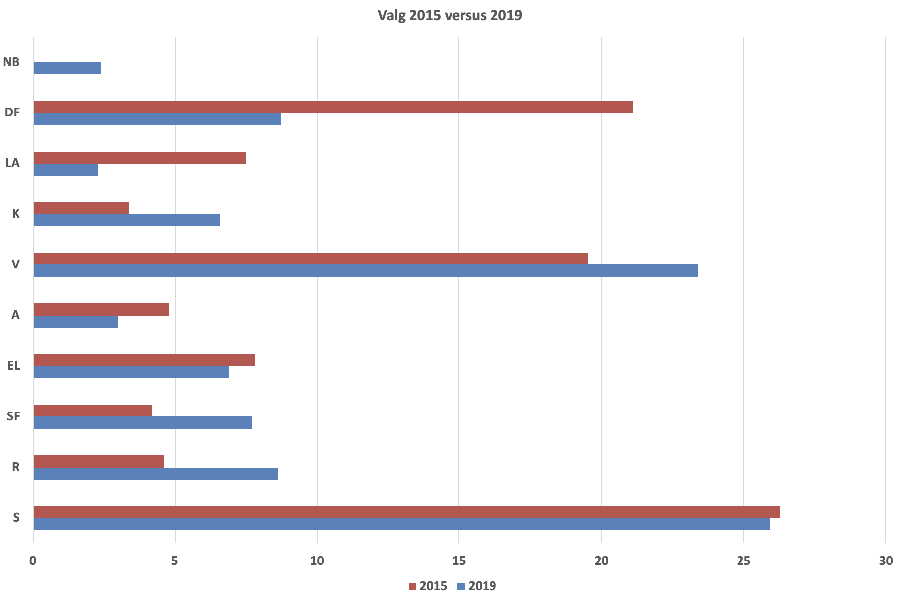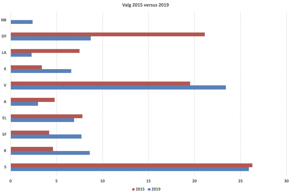 Socialdemokratiet (S) ble Danmarks største parti med 25,9 prosent av stemmerne, men det nest største ble Venstre 23,4 prosent. Det forteller oss igjen at S hadde en svak tilbakegang på 0,4 prosentpoeng fra forrige valg (2015), mens V hadde en fremgang på 3,9 prosentpoeng.