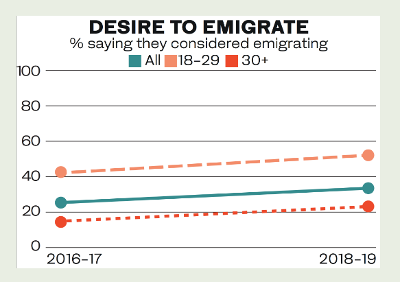 Ett av de kanskje mest oppsiktsvekkende funnene er at hele 70 prosent av de unge (18-29 år) i Marokko oppgir at de ønsker å emigrere. Totalt svarer nesten halvparten fra Sudan, Jordan og Marokko det samme, mens en tredjedel av irakerne vurderer det samme.