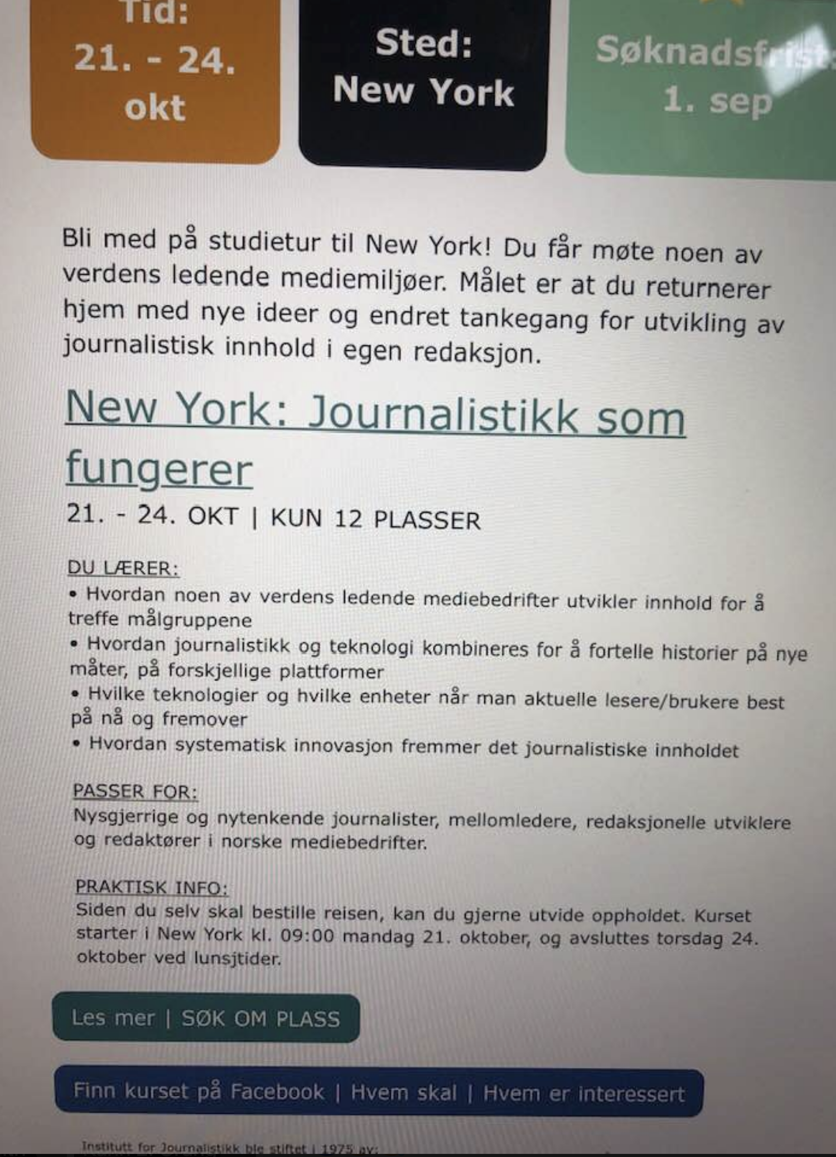 Mens dette foregår i flaggskipet for den frie presse, så inviterer Institutt for Journalistikk til studietur til nettopp New York. For den nette sum av kr. 12.000 i kurspenger, der en selv må dekke reise, kost og losji, kan du blant annet lære «Hvordan noen av verdens ledende mediebedrifter utvikler innhold for å treffe målgruppene».