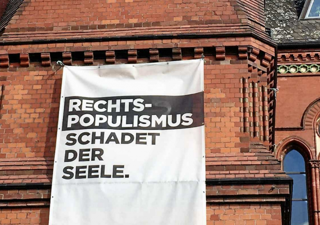 Bøye viser i denne sammenheng til et banner som vaier på en evangelisk kirke i Berlin: RECHTSPOPULISMUS schadet der Seele (på norsk: HØYREPOPULISMEN skader sjelen).