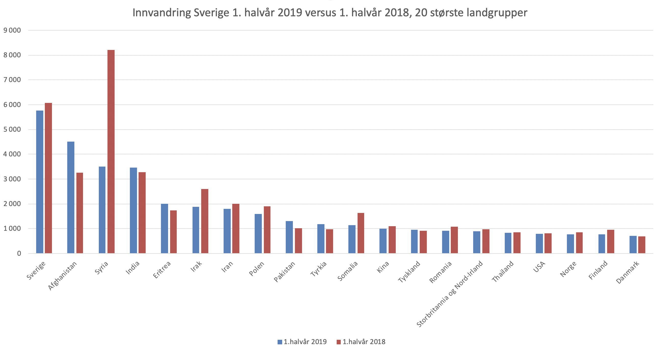 Av de som innvandret var det i første halvår i år 5.753 svensker, mot 6.078 samme periode i fjor, en nedgang på 5,3 prosent. Nå er det vanskelig å vite om vi snakker etniske svensker som returnerer til Sverige eller om det er personer med innvandrerbakgrunn som returnerer, det vi vet er at disse er født i Sverige. Det er denne gruppen som er størst, i motsetning til i fjor da syrere toppet statistikken med 8.199 innvandrede i første halvår. I første halvår i år kom 3.511 syrere, en nedgang på over 57 prosent fra i fjor, og den gruppen med størst nedgang.